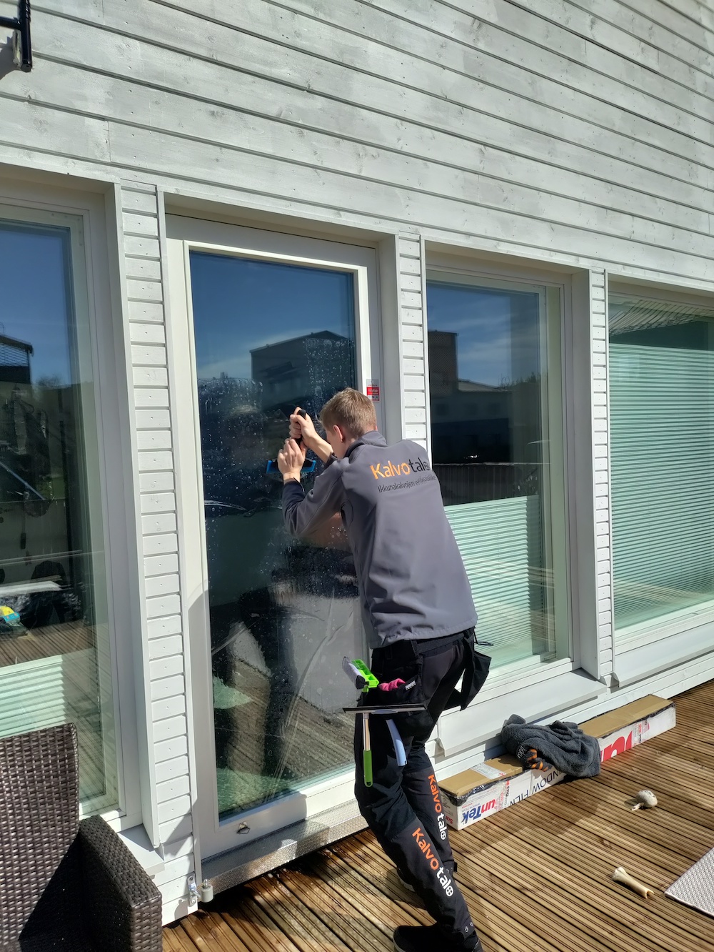Kalvoksi valittiinkin sisäasennuskalvoja lasien väliin asennettavaksi. Varjoisammalle puolelle asennettiin UV-suojakalvo, jolla saadaan 99 % uv-suojaus.