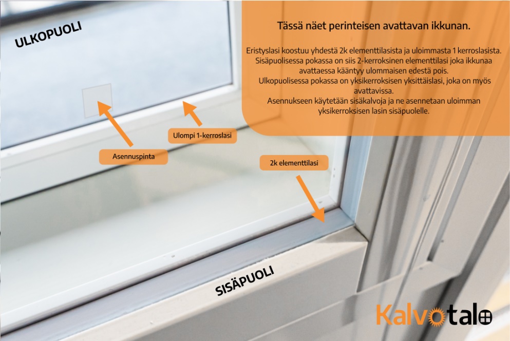 Jos sinulla taas on avattava ikkuna, niin kalvo asennetaan uloimman lasin sisäpintaan. Kuten kuvassa näet.